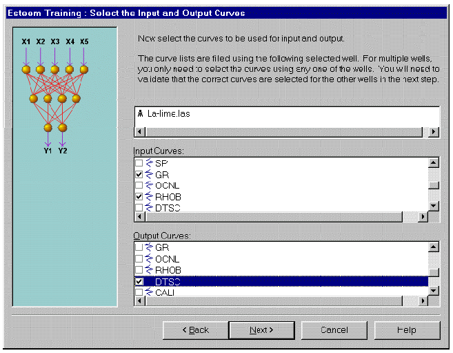 Estimation of DTSC from RHOB and GR, input and output curves selection