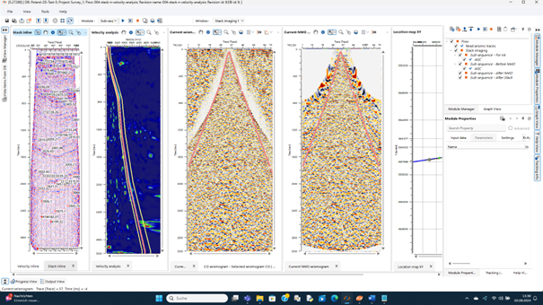 Velocity Analysis (v) come with a variety of modules: stack Imaging, v Analysis, horizontal v Analysis, velocity model. These powerful methods allow an efficient data QC through semblance, optimal analysis for multiple attenuation, azimutal control for anisotropy and AVO, QC on vertical, horizontal, azimuthal velocities with sonic logs for reservoir parametrization.